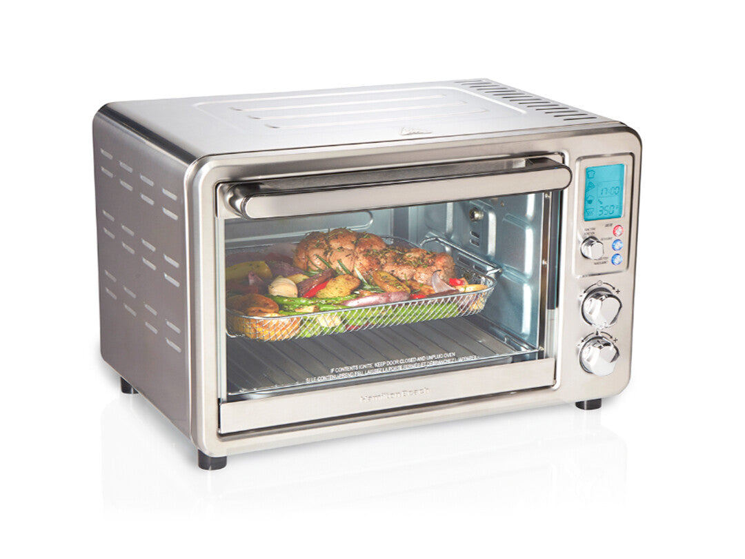 The Hamilton Beach® Sure-Crisp® Digital Air Fryer Toaster Oven with Rotisserie combines Sure-Crisp® air frying functionality with the versatility of a rotisserie and classic toaster oven. You get the even crisping and browning of air frying right on your countertop, along with the ability to rotisserie, toast, bake and broil. Using little to no oil, the Sure-Crisp function turns fresh or frozen French fries, chicken wings, steaks, fish, vegetables and more into crispy deliciousness that you and your family will love. The Hamilton Beach Sure-Crisp Digital Air Fryer Toaster Oven provides plenty of cooking space and lets you rotisserie a whole chicken, cook a 12" pizza or toast 6 slices of bread. The intuitive controls include 6 settings to cover every cooking need and a digital LED panel to keep you informed about the preheating status, remaining cooking time and current temperature. The oven features 3 rack positions for cooking flexibility and it includes a mesh air-fry basket, rotisserie accessories, bake pan, broil rack and slide-out crumb tray.